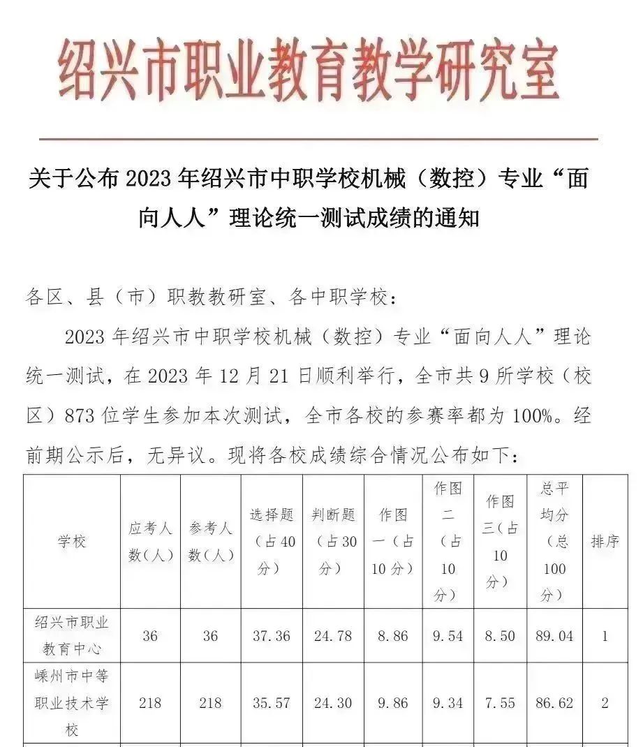 2023年,學(xué)校計劃招生798人,實際招生857人,完成率108.9%,新生超過普高分數(shù)線(539分)123人,占14%,500分以上308人,占36%,平均分459分,最高分627分,新生生源進入紹興市第一梯隊,位列紹興市第二位。優(yōu)質(zhì)的生源促進了學(xué)科成績的提升,在2023年省面向人人測中電商專業(yè)排紹興市第1名,數(shù)學(xué)成績紹興市第3名,英語成績紹興市第3名,機電專業(yè)紹興市第3名,語文成績紹興市第4名。在2023年紹興市中職學(xué)校高二語數(shù)英面向人人統(tǒng)測中,總分全市第一。