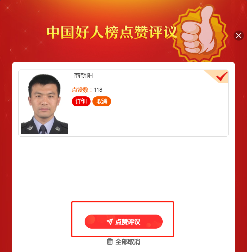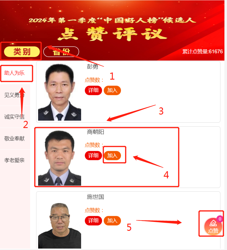 或者選擇“類(lèi)別”→助人為樂(lè)→找到商朝陽(yáng)→點(diǎn)擊“加入”→點(diǎn)擊“點(diǎn)贊”按鈕→點(diǎn)擊“點(diǎn)贊評(píng)議”