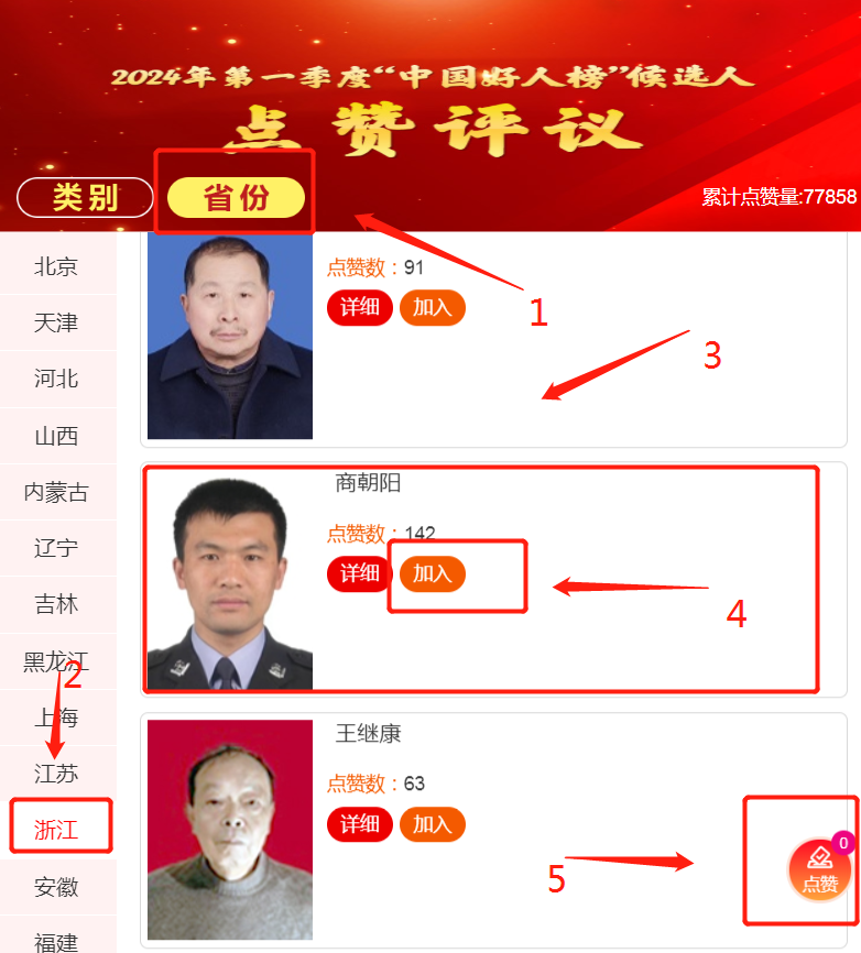 第二步:點(diǎn)擊“省份”→浙江省→找到商朝陽(yáng)→點(diǎn)擊“加入”→點(diǎn)擊“點(diǎn)贊”按鈕→點(diǎn)擊“點(diǎn)贊評(píng)議”