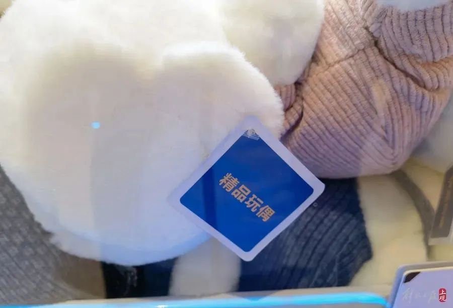 而另一家娃娃機主題店內(nèi),初步統(tǒng)計顯示,在幾十臺娃娃機里,有符合國家標(biāo)準(zhǔn)標(biāo)簽或吊牌的娃娃占比不足一半。部分無任何標(biāo)簽的娃娃,做工比較粗糙,填充物都幾乎從接縫處漏出來了。- 另一臺里的娃娃掛著“精品玩偶”的標(biāo)簽,但標(biāo)簽背面并沒有生產(chǎn)信息,只有安全提示;