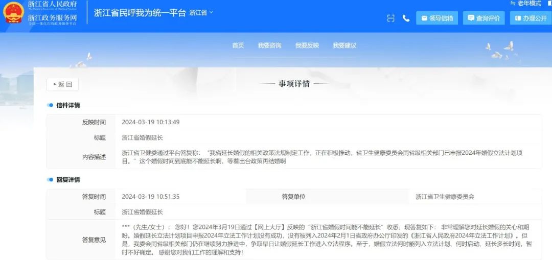 浙江省衛(wèi)健委通過平臺回復(fù)稱:“我省延長婚假的相關(guān)政策法規(guī)制定工作,正在積極推動中,省衛(wèi)生健康委員會同省級相關(guān)部門已申報2024年婚假立法計劃項目?!?strong>這個婚假時間到底能不能延長啊?