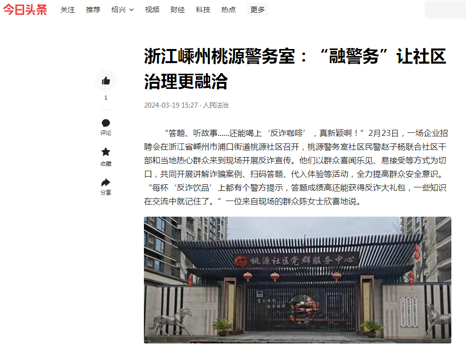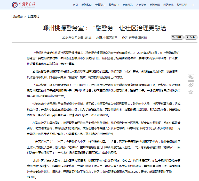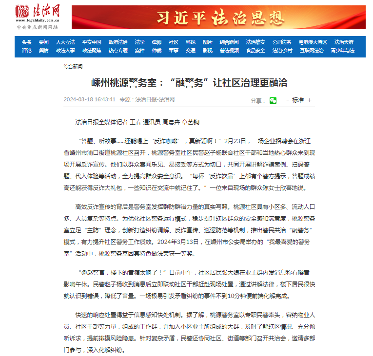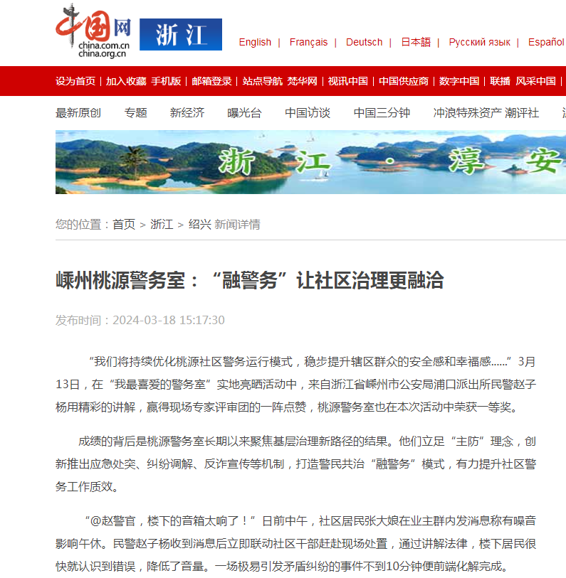 2024年3月13日,在嵊州市公安局舉辦的“我最喜愛的警務(wù)室”實(shí)地亮?xí)窕顒?dòng)中,桃源警務(wù)室因其特色做法榮獲一等獎(jiǎng)。