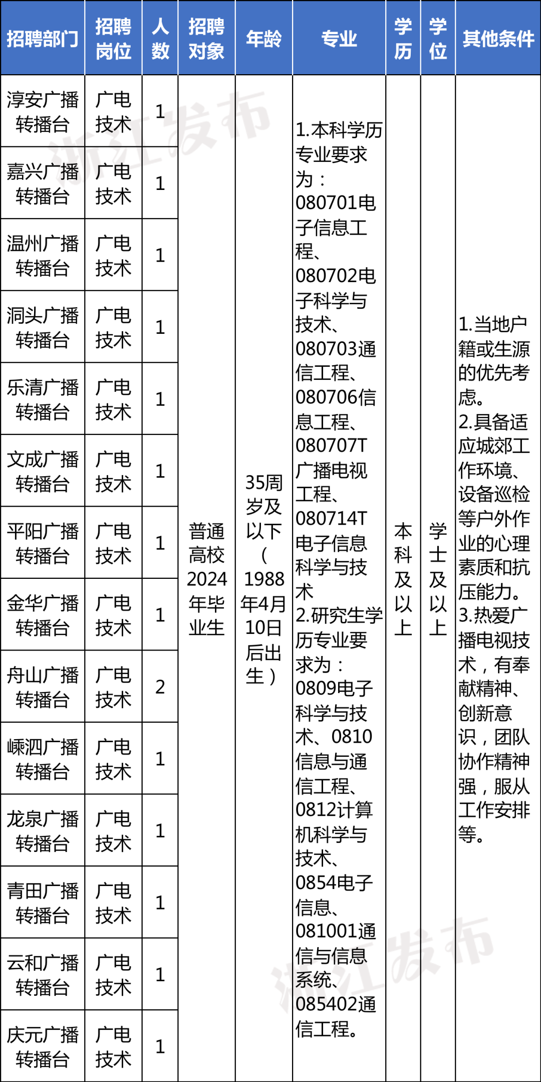 浙江省中波發(fā)射管理中心為浙江廣播電視集團(tuán)下屬公益一類事業(yè)單位,主要承擔(dān)中國之聲和浙江之聲廣播節(jié)目的中波傳輸覆蓋,開展智慧中波臺建設(shè)等工作。本批次需求崗位為廣電技術(shù),人數(shù)為15人,定崗在14家各地轉(zhuǎn)播臺。