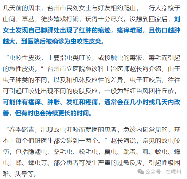 近日,省內(nèi)各大醫(yī)院接診了不少蟲(chóng)咬皮炎患者,大多是在出門(mén)游玩或踏青賞景途中,被各類(lèi)昆蟲(chóng)叮咬而引起的過(guò)敏。