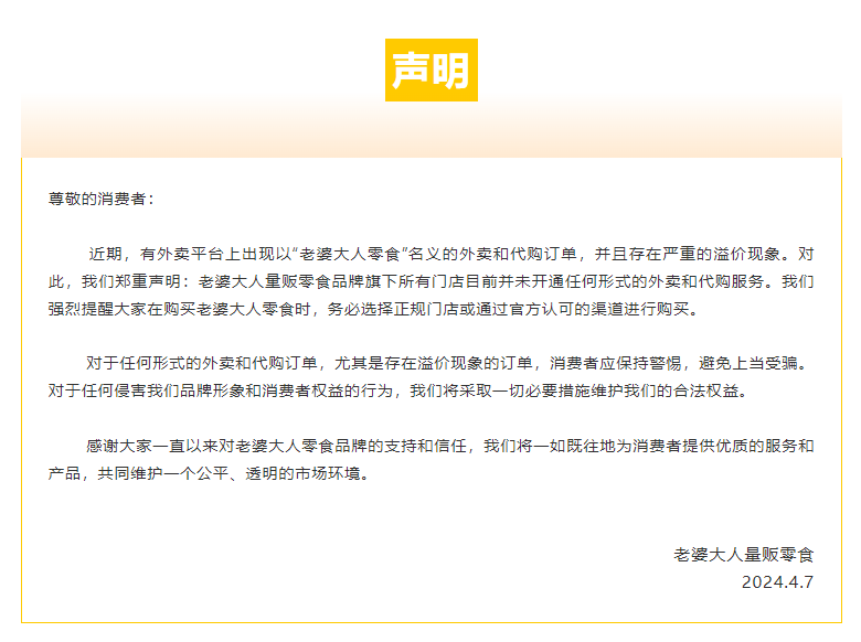 近期,有外賣平臺上出現(xiàn)以“老婆大人零食”名義的外賣和代購訂單,并且存在嚴(yán)重的溢價現(xiàn)象。對此,我們鄭重聲明:老婆大人量販零食品牌旗下所有門店目前并未開通任何形式的外賣和代購服務(wù)。我們強(qiáng)烈提醒大家在購買老婆大人零食時,務(wù)必選擇正規(guī)門店或通過官方認(rèn)可的渠道進(jìn)行購買。