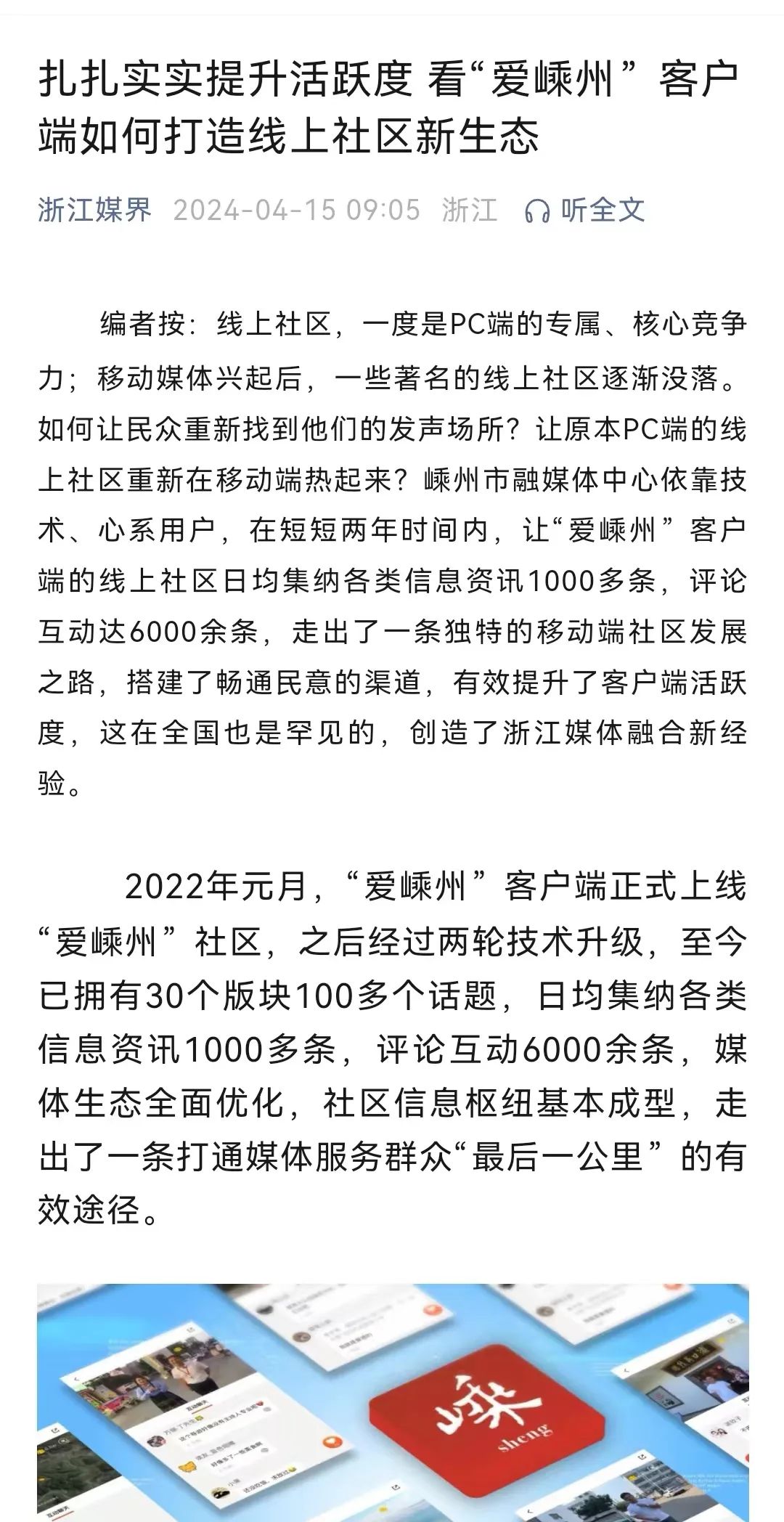 編者按:線上社區(qū),一度是PC端的專屬、核心競爭力;移動媒體興起后,一些著名的線上社區(qū)逐漸沒落。如何讓民眾重新找到他們的發(fā)聲場所?讓原本PC端的線上社區(qū)重新在移動端熱起來?嵊州市融媒體中心依靠技術、心系用戶,在短短兩年時間內,讓“愛嵊州”客戶端的線上社區(qū)日均集納各類信息資訊1000多條,評論互動達6000余條,走出了一條獨特的移動端社區(qū)發(fā)展之路,搭建了暢通民意的渠道,有效提升了客戶端活躍度,這在全國也是罕見的,創(chuàng)造了浙江媒體融合新經驗。