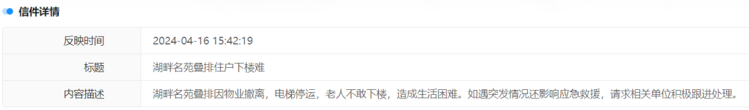 湖畔名苑疊排因物業(yè)撤離,電梯停運,老人不敢下樓,造成生活困難。如遇突發(fā)情況還影響應急救援,請求相關單位積極跟進處理。