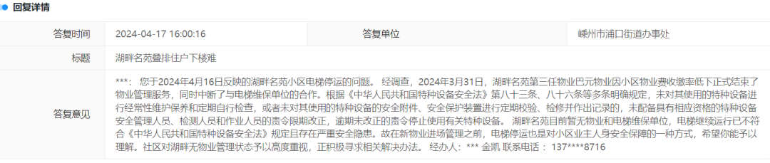 湖畔名苑目前暫無物業(yè)和電梯維保單位,電梯繼續(xù)運行已不符合《中華人民共和國特種設備安全法》規(guī)定目存在嚴重安全隱患,故在新物業(yè)進場管理之前,電梯停運也是對小區(qū)業(yè)主人身安全保障的一種方式,希望你能予以理解。社區(qū)對湖畔無物業(yè)管理狀態(tài)予以高度重視,正積極尋求相關解決辦法。 經(jīng)辦人:*** 金凱 聯(lián)系電話:137****8716