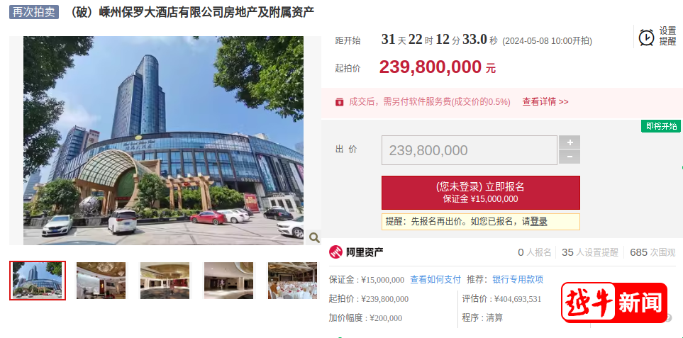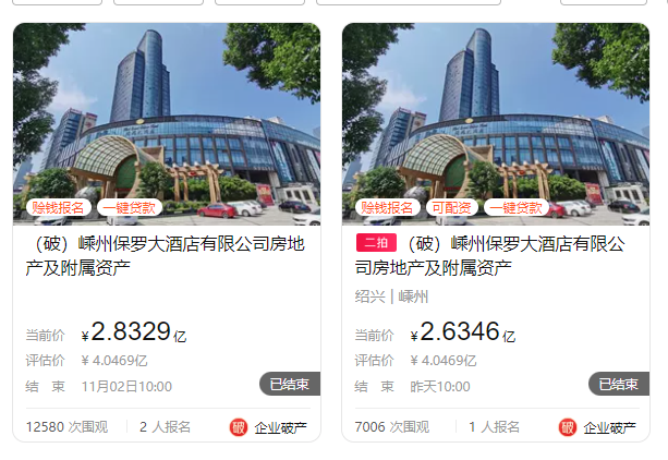據(jù)阿里拍賣網(wǎng)顯示,紹興嵊州保羅大酒店有限公司房地產(chǎn)及附屬資產(chǎn)將于5月8日10:00進(jìn)行第五次公開拍賣,起拍價(jià)2.398億起。