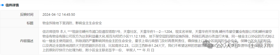問:信訪局領導:本人 **現(xiàn)居住嵊州市浦口街道雙塔路1號,天章社區(qū),天章華府1-2-****,現(xiàn)實名舉報,天章華府開發(fā)商,嵊州市星空置業(yè)有限公司和嵊州星空物業(yè)有限公司雙方為達到利益最大化,相互勾結(jié)把小區(qū)11.12.13棟,地下架空層的消防設施拆除,拆除后再進行改造打夾墻,同一樓業(yè)主以協(xié)議的方式轉(zhuǎn)讓給一樓業(yè)主使用居住,拆除消防嚴重影響其他業(yè)主的生命安全,要求上級行政部門及時再查其責任,確保樓上以及小區(qū)居民的生命安全,保障小區(qū)業(yè)主的利益。以及再近全國各地消防火災的悲劇歷歷在目,比如南京2,23,以及江西新余1.24火災,我們不希望這樣的悲劇發(fā)生在我們小區(qū),希望上級領導以生命至上人民至上的原則盡快盡力處理為盼,附小區(qū)業(yè)主聯(lián)名簽字一份,舉報人***年月 日