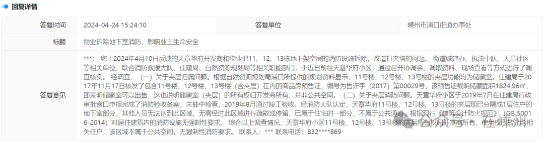 答:**: 您于2024年4月10日反映的天章華府開發(fā)商和物業(yè)把11、12、13棟地下架空層的消防設施拆除,改造打夾墻的問題。街道城建辦、執(zhí)法中隊、天章社區(qū)等相關單位,聯(lián)合消防救援大隊、住建局、自然資源規(guī)劃局等相關職能部門,于近日前往天章華府小區(qū),通過召開協(xié)調(diào)會、調(diào)取資料、現(xiàn)場查看等方式進行了調(diào)查核實。經(jīng)調(diào)查,(一)關于夾層歸屬問題。根據(jù)自然資源規(guī)劃局浦口所提供的規(guī)劃資料顯示,11號樓、12號樓、13號樓的夾層功能均為儲藏室。住建局于2017年11月17日核發(fā)了包含11號樓 12號樓13號樓(含夾層)在內(nèi)的商品房預售證、編號為售許字(2017)第00029號、該預售證載明儲藏面和1824.96平方、即表明儲藏室可以出售,這也說明儲藏室(夾層)的所有權歸開發(fā)商所有,并非公共空間。(二)關于夾層消防問題,天章華府小區(qū)于2019年7月在住建局行政審批窗口申報完成了消防驗收備案,未抽中檢查,2019年8月通過竣工驗收。經(jīng)消防大隊認定,天章華府11號樓、12號樓、13號樓的夾層現(xiàn)已分隔成1層住戶的地下室部分,其他人員無法達到此區(qū)域,無需經(jīng)過此區(qū)域進行疏散或停留,已屬于住宅的一部分,不屬于公共通道,根據(jù)現(xiàn)行《建筑設計防火規(guī)范》(GB50016-2014)對居住建筑內(nèi)的消防設施無強制性要求。綜合以上調(diào)查情況,天章華府小區(qū)11號樓、12號樓、13號樓的夾層所有權歸開發(fā)商所有,使用權已轉(zhuǎn)讓給相關住戶,該區(qū)域不屬于公共空間,無強制性消防要求。聯(lián)系人:*** 聯(lián)系電話:832****869來源:浙江省民呼我為統(tǒng)一平臺