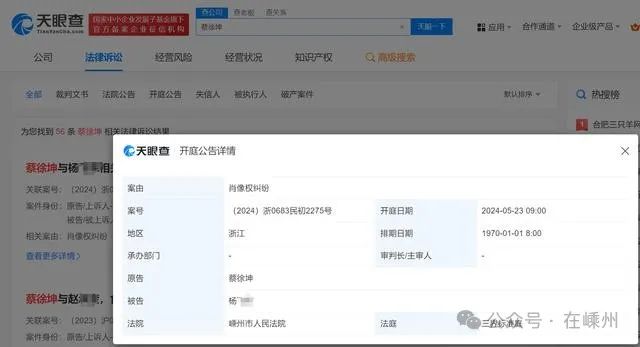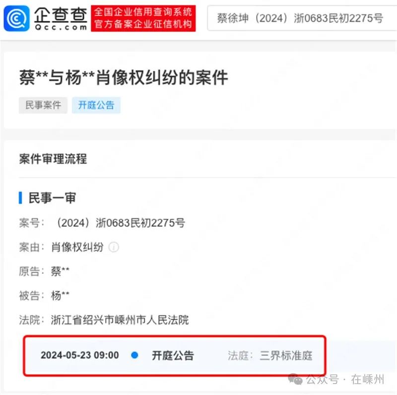 據(jù)天眼查、企查查法律訴訟信息顯示,近日,蔡徐坤與楊某某相關(guān)肖像權(quán)糾紛案件新增開庭公告,原告為蔡徐坤,該案將于5月23日上午9:00,在紹興市嵊州市人民法院開庭審理。