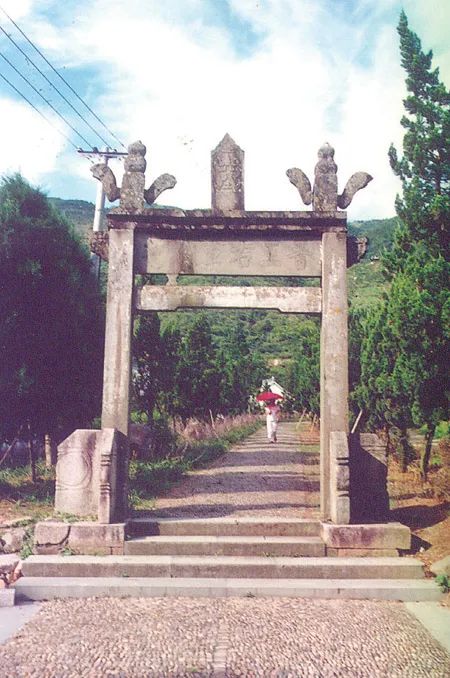 始建于唐朝的王羲之墓道坊,早已損毀,眼下這座牌坊由王氏后裔在清朝道光年間重建,“晉王右軍墓道”刻于上。周遭青苔遍布,灌木叢生,古柏森森,宛若一片植物秘境。沿一條彎曲的鵝卵石墓道踏級而上,盡頭就是王羲之墓。