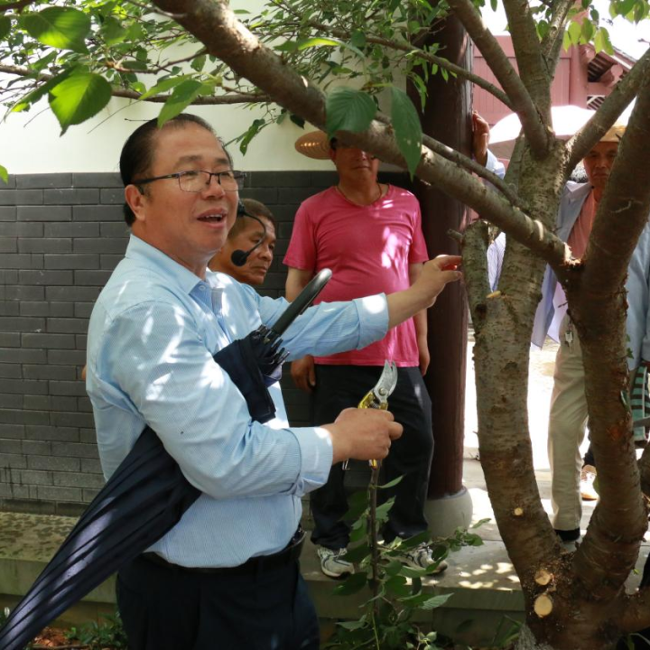 原嵊州市園林管理處高級(jí)園藝師,從事嵊州園林工程建設(shè),綠化養(yǎng)護(hù)工作40年,參與我市鹿山公園一期、白沙地科技園等多項(xiàng)重大工程建設(shè)。以嫻熟高超的修剪技藝為學(xué)員們做了詳細(xì)的示范。