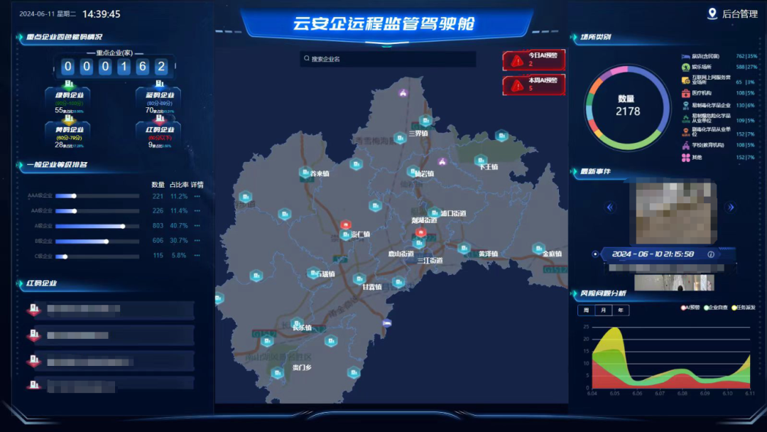 風(fēng)險問題分析、紅碼企業(yè)名單、每日AI預(yù)警、重點企業(yè)三色賦碼情況……走進嵊州市公安局行政監(jiān)管中心,只見藍色大屏上滾動著各類企業(yè)信息,一屏展示多屏聯(lián)動,智能化場景應(yīng)用比比皆是。這是“云安企”遠程智管平臺的可視化展示窗口,其中最引人注意的是企業(yè)信用“紅、黃、綠”三色賦碼。
