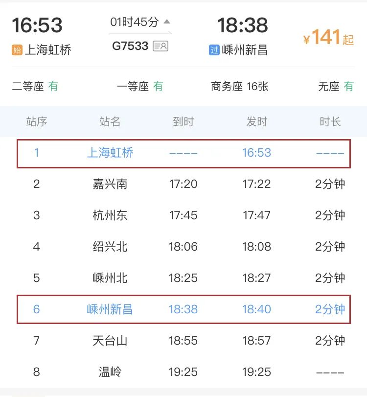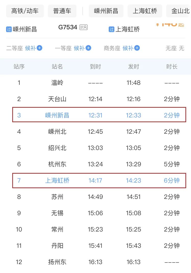 新增上海虹橋一溫嶺G7533次,嵊州新昌站到開點:18:38/18:40。