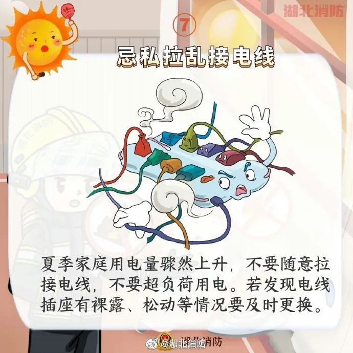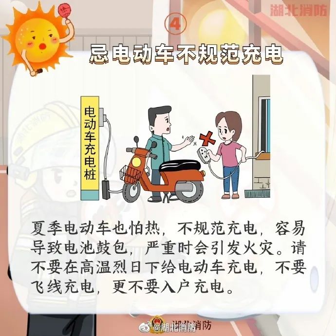 電動(dòng)自行車長(zhǎng)時(shí)間充電或私拉亂接電線充電,容易導(dǎo)致電池溫度過高,再加上夏季室外高溫,極易引發(fā)火災(zāi)。