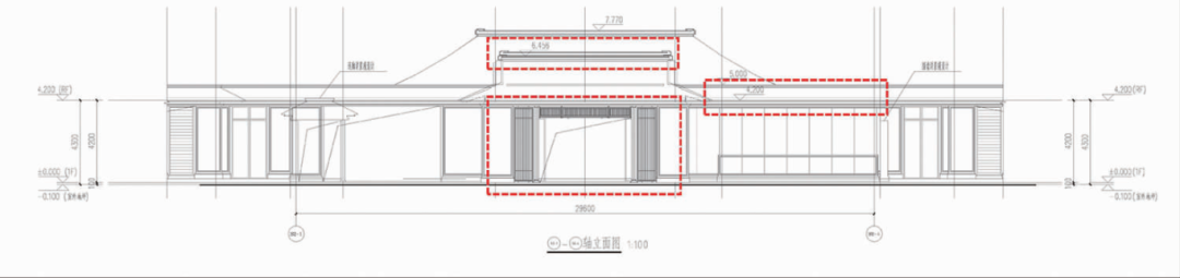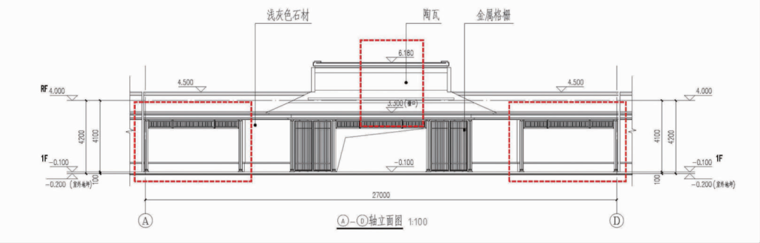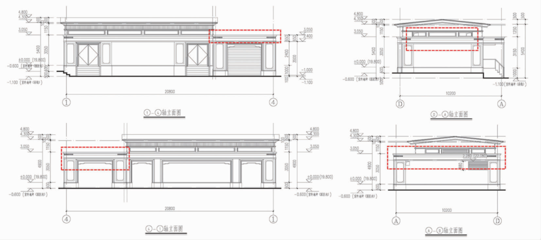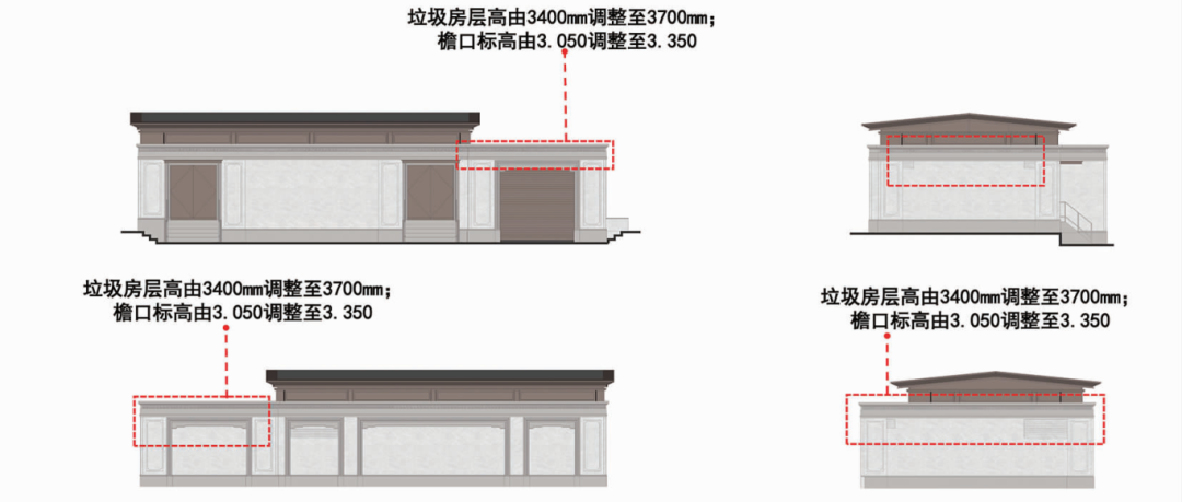 3、垃圾房層高由3400mm調(diào)整至3700mm;檐口標(biāo)高由 3.050調(diào)整至3.350;各立面圖、剖面圖中立面造型線條標(biāo)高相應(yīng)調(diào)整。