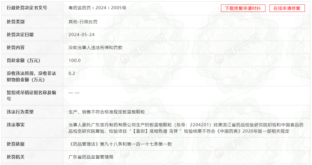 行政處罰決定書顯示,今年5月,香雪制藥委托廣東寶丹制藥有限公司(下稱“寶丹制藥公司”)生產的板藍根顆粒(批號:2204201),經黑龍江省藥品檢驗研究院初檢和中國食品藥品檢定研究院復驗,檢驗項目“【鑒別】液相色譜 鳥苷 ”檢驗結果不符合《中國藥典》2020年版一部相關規(guī)定。