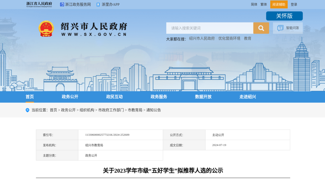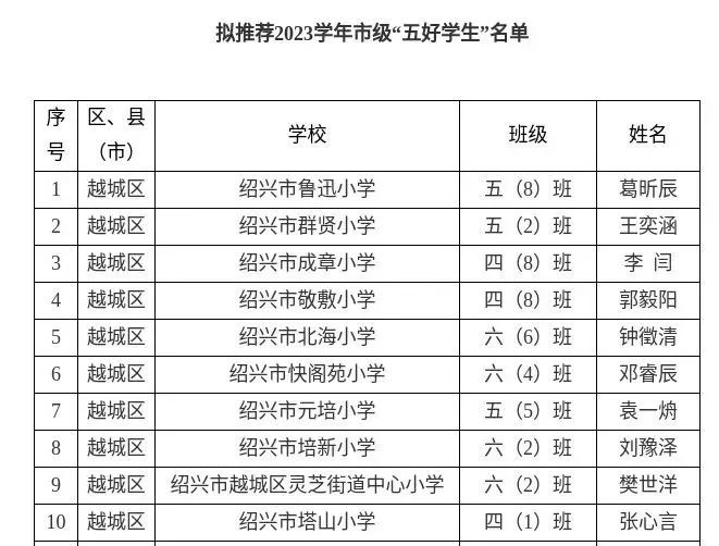 近日,紹興市人民政府發(fā)布一則《關(guān)于2023學(xué)年市級“五好學(xué)生”擬推薦人選的公示》。