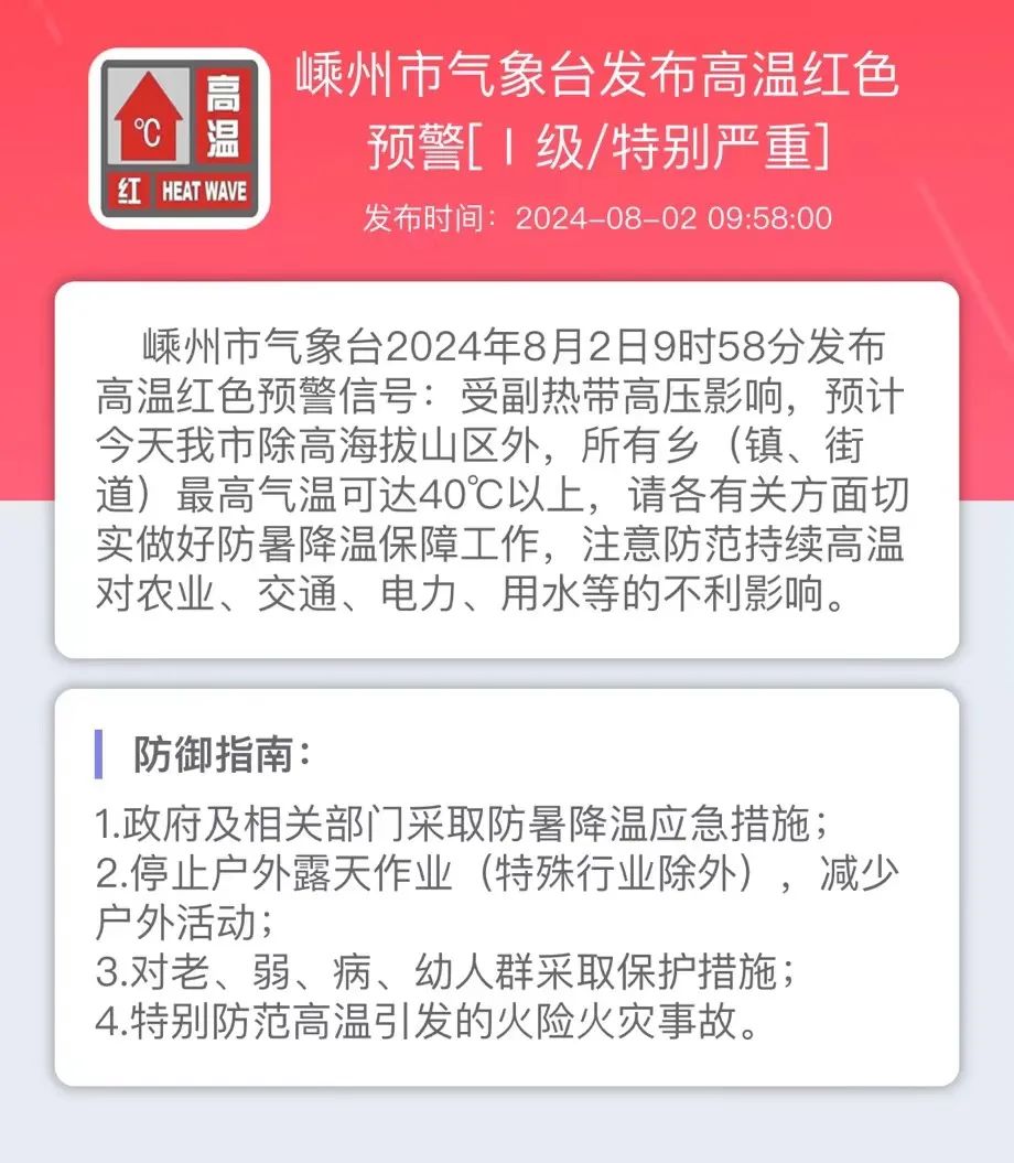 嵊州市氣象臺(tái)2024年8月2日9時(shí)58分發(fā)布高溫紅色預(yù)警信號(hào):受副熱帶高壓影響,預(yù)計(jì)今天我市除高海拔山區(qū)外,所有鄉(xiāng)(鎮(zhèn)、街道)最高氣溫可達(dá)40℃以上,請(qǐng)各有關(guān)方面切實(shí)做好防暑降溫保障工作,注意防范持續(xù)高溫對(duì)農(nóng)業(yè)、交通、電力、用水等的不利影響。
