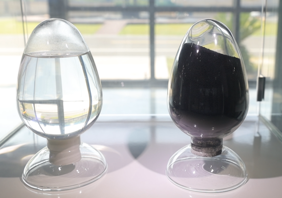 在一系列專業(yè)術(shù)語的介紹下,見記者一知半解,滕明才拿出了兩包顆粒狀物品?!斑@兩包就是PBT材料,白色這包是這塊紫布的原材料。黑色這包是升級版,帶阻燃性能,而且不會褪色,今年7月份剛研發(fā)出來,能廣泛應(yīng)用于高端的面料紡織?!彪鞑耪f。