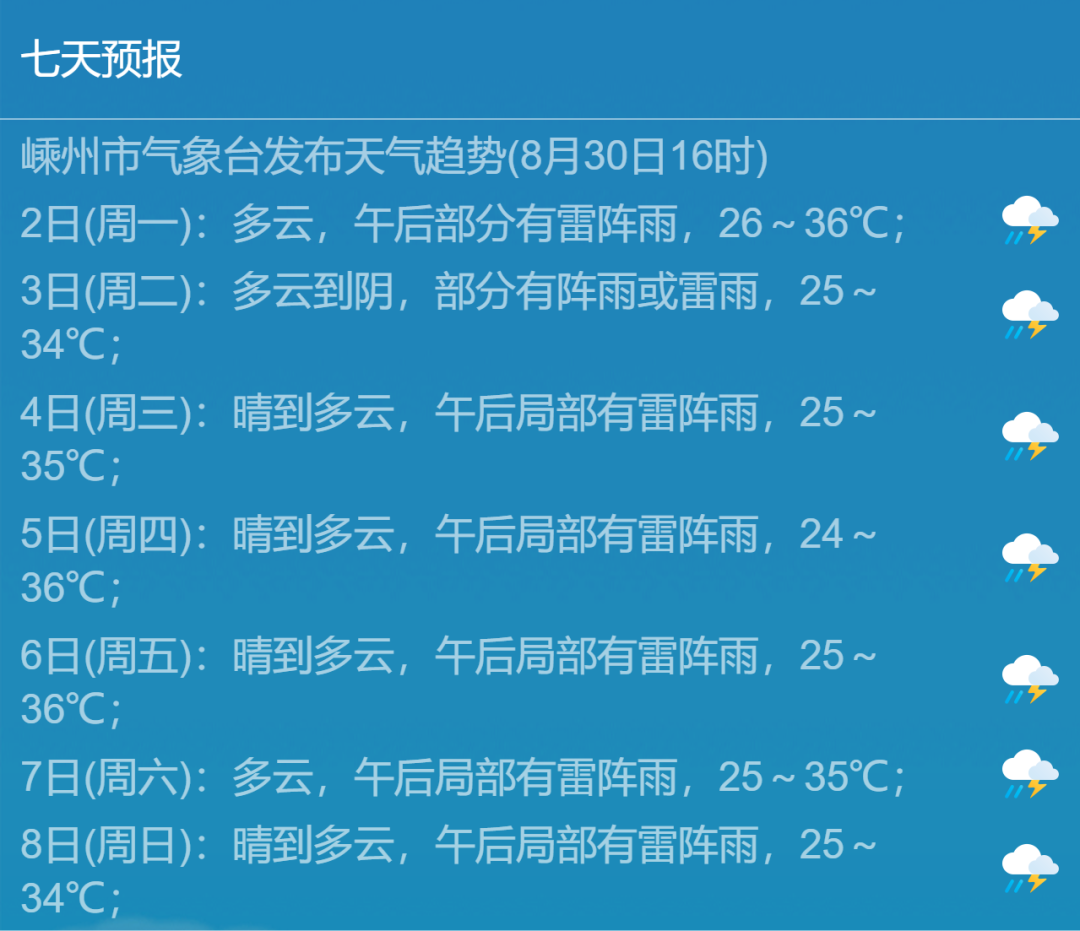 嵊州市氣象臺(tái)8月31日10:30發(fā)布的天氣預(yù)報(bào):