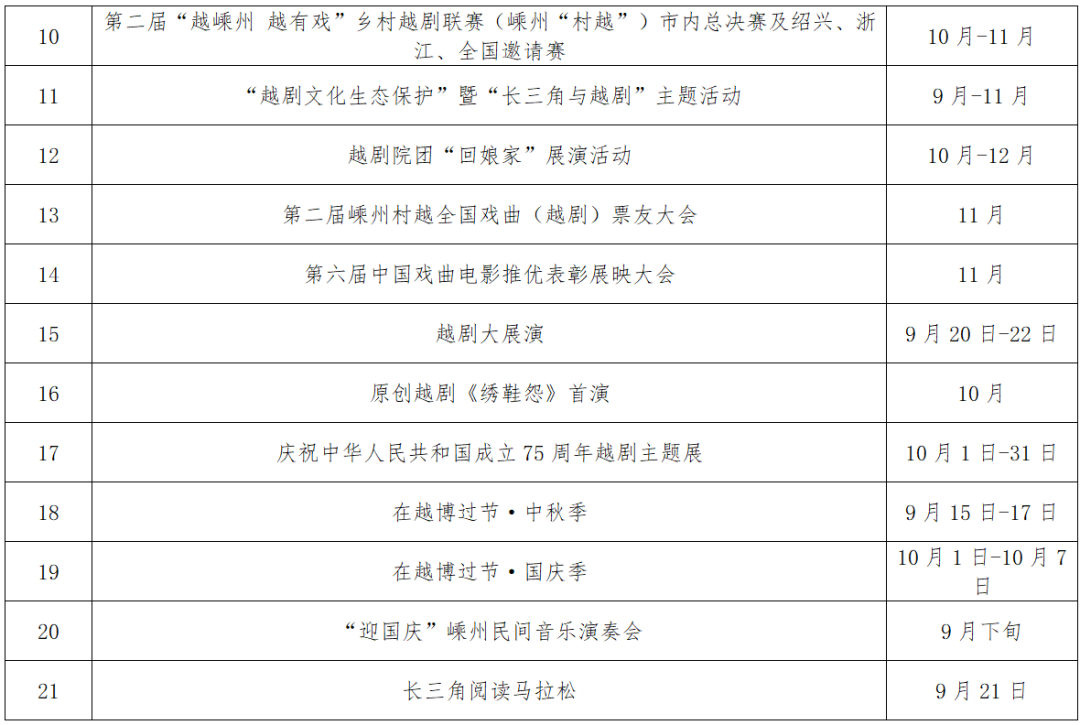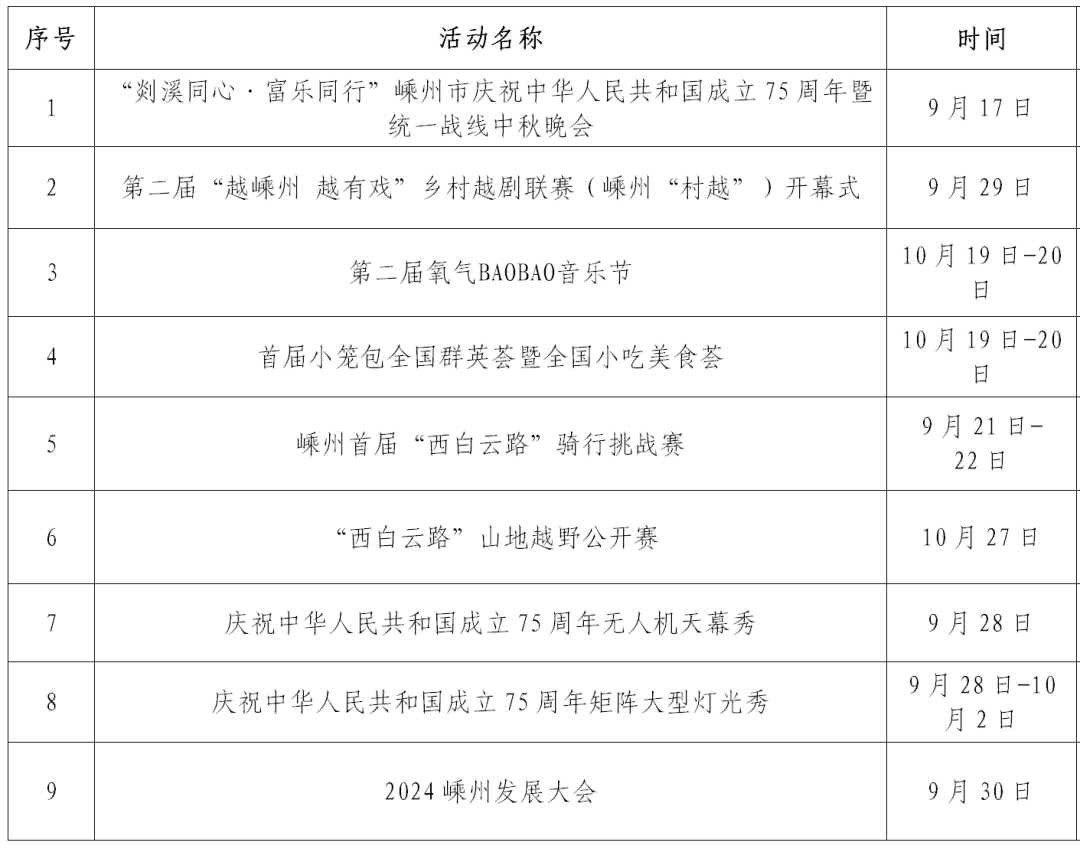 圍繞“富樂嵊州 喜迎雙節(jié)”主題,以越劇、小吃、音樂、體育等為載體,通過精心策劃,共推出第二屆“越嵊州 越有戲”鄉(xiāng)村越劇聯(lián)賽開幕式、第二屆氧氣BAOBAO音樂節(jié)、嵊州首屆“西白云路”騎行挑戰(zhàn)賽等50項(xiàng)活動(dòng)。