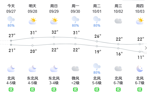 本周前期氣溫氣溫小幅回升,最高氣溫在28-30℃,出現(xiàn)在9月29日至30日。冷空氣預(yù)計國慶假期影響嵊州,10月1日起受冷空氣影響,嵊州氣溫將明顯回落,預(yù)計10月3日最高溫度僅22℃,最低溫低僅16℃。