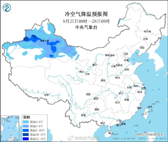 據(jù)中央氣象臺,9月26日起一股強冷空氣從新疆啟程,自西向東影響我國大部地區(qū),帶來大范圍的大風(fēng)、強降溫和降水天氣。26日至10月1日,我國大部地區(qū)氣溫下降6~8℃。