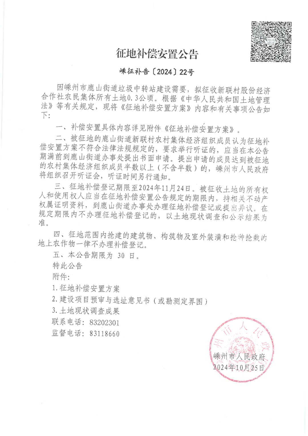 剛剛,嵊州市人民政府網(wǎng)站發(fā)布了一則征地補(bǔ)償安置方案,涉及鹿山街道新聯(lián)村,用作垃圾中轉(zhuǎn)站。
