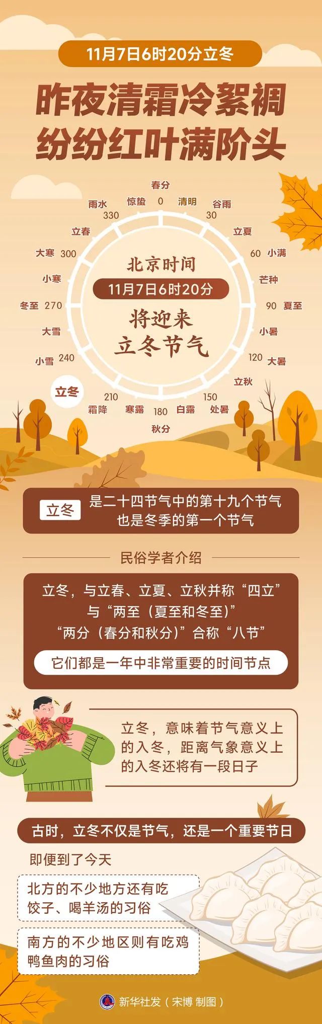 習(xí)慣上,我國(guó)民間常把立冬這一天當(dāng)作冬季的開(kāi)始。這一節(jié)氣不僅是收獲祭祀與豐年宴會(huì)隆重舉行的時(shí)間,也是寒風(fēng)乍起的季節(jié)。立冬是二十四節(jié)氣中的第十九個(gè)節(jié)氣,其確定的依據(jù)是以太陽(yáng)到達(dá)黃經(jīng)225度為準(zhǔn),在公歷的11月7日或8日。
