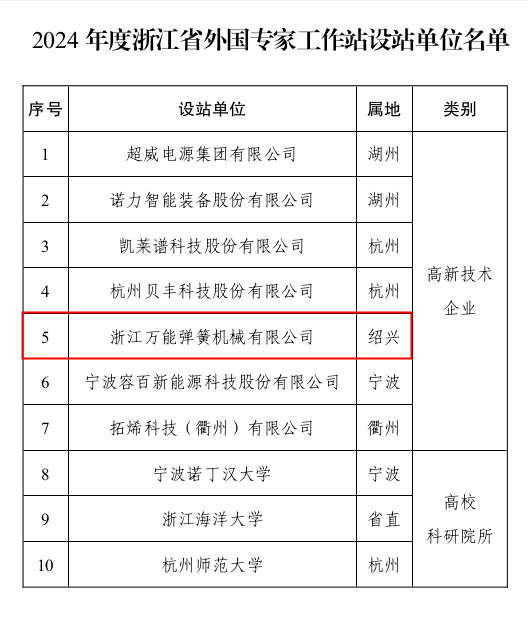日前,省人力社保廳(省外國專家局)公布2024年度浙江省外國專家工作站設(shè)站單位名單,我市1家單位(浙江萬能彈簧機(jī)械有限公司)入選。