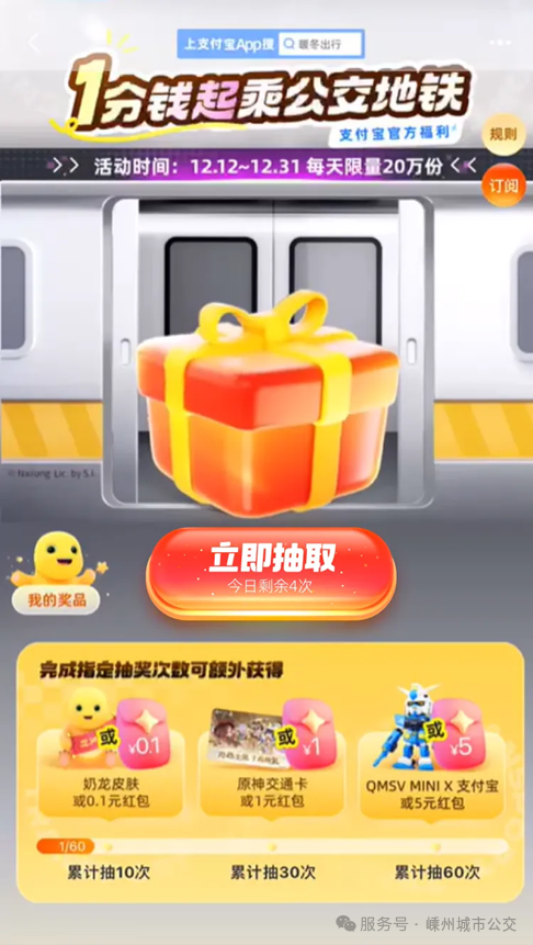 每人每日可抽獎(jiǎng)5次,有機(jī)會(huì)抽取1.99元公交地鐵券。此外,還有客運(yùn)、網(wǎng)約車(chē)、共享單車(chē)等全場(chǎng)景出行優(yōu)惠券等您來(lái)領(lǐng)?