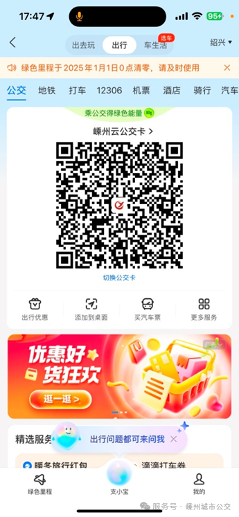 2025年1月1日-2025年6月1日,已通過(guò)支付寶實(shí)名認(rèn)證的注冊(cè)用戶(hù),通過(guò)支付寶APP掃取本公眾號(hào)中支付寶優(yōu)惠乘車(chē)二維碼或紹興公交車(chē)站支付寶活動(dòng)宣傳易拉寶中二維碼進(jìn)入活動(dòng)頁(yè)面,即可獲得一個(gè)最高1.99元的公交乘車(chē)優(yōu)惠紅包,搭乘公交單筆消費(fèi)最高可抵扣1.99元,領(lǐng)取后7*24小時(shí)內(nèi)有效。