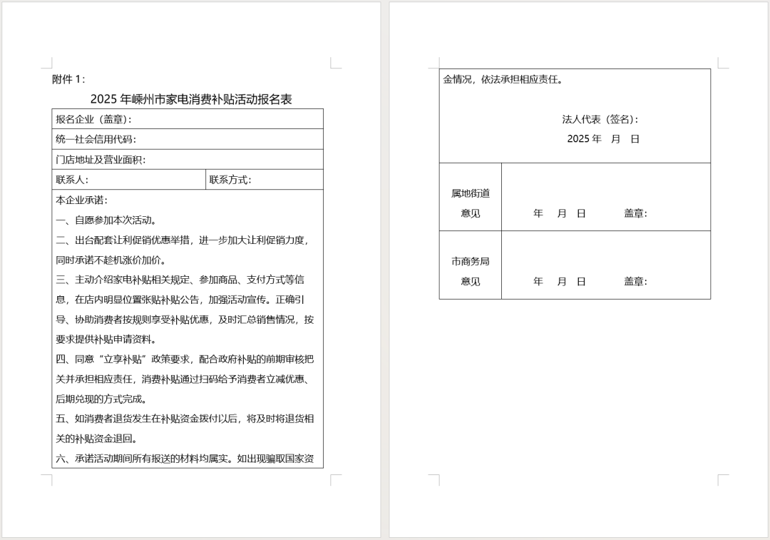 根據(jù)上級(jí)要求,現(xiàn)組織開展我市家電以舊換新活動(dòng)商家報(bào)名工作,具體通知如下:符合條件且有意向參與活動(dòng)的家電零售企業(yè)請(qǐng)?jiān)谝?guī)定報(bào)名時(shí)間內(nèi)到所在地鄉(xiāng)鎮(zhèn)(街道)經(jīng)濟(jì)發(fā)展辦公室報(bào)名,并按要求提供所需材料(蓋公章)交嵊州市商務(wù)局(國資綜合大樓1705辦公室):2.營業(yè)執(zhí)照(復(fù)印件);4.近三年內(nèi)(新企業(yè)自注冊(cè)之日起)無重大違法失信行為證明(通過信用中國或者信用浙江可查詢)參與活動(dòng)的家電零售企業(yè)需符合以下條件:1.參與活動(dòng)企業(yè)需在嵊州市范圍內(nèi)注冊(cè),且近三年內(nèi)(新企業(yè)自注冊(cè)起)無重大違法失信行為。2.有健全的財(cái)務(wù)制度和進(jìn)銷存臺(tái)賬,能夠開具正規(guī)銷售發(fā)票,有銀行對(duì)公結(jié)算賬戶,有相關(guān)品牌授權(quán)書或經(jīng)銷協(xié)議。3.開設(shè)換新專區(qū),制定本企業(yè)家電消費(fèi)補(bǔ)貼配套方案和具體優(yōu)惠措施,開設(shè)以舊換新專區(qū),張貼統(tǒng)一標(biāo)識(shí),標(biāo)明參與活動(dòng)的產(chǎn)品及降價(jià)優(yōu)惠。活動(dòng)期間參與企業(yè)不得借機(jī)抬高商品價(jià)格,不得撤架暢銷商品,不得搭售滯銷商品。4.認(rèn)真執(zhí)行政策。支持并遵守本次補(bǔ)貼活動(dòng)規(guī)則,按照實(shí)施方案開展工作,接受事先墊資、過程結(jié)算,并支付結(jié)算平臺(tái)相關(guān)手續(xù)費(fèi),接受主辦方在法律許可范圍內(nèi)修改活動(dòng)條款及細(xì)則、暫?;蛉∠顒?dòng)。5.建立完整清晰的活動(dòng)臺(tái)賬。具備可以和服務(wù)平臺(tái)進(jìn)行對(duì)接的能力,能安排相應(yīng)工作人員做好相應(yīng)臺(tái)賬的整理。活動(dòng)臺(tái)賬應(yīng)包括但不限于銷售發(fā)票、消費(fèi)者購買清單(含消費(fèi)者姓名、身份證號(hào)、聯(lián)系電話、購買產(chǎn)品名稱及唯一編碼、銷售額及補(bǔ)貼額等),本企業(yè)開展家電消費(fèi)補(bǔ)貼配套方案和具體優(yōu)惠措施,以舊換新專區(qū)照片等。6.嚴(yán)格遵守各項(xiàng)法律法規(guī)并接受社會(huì)各方監(jiān)督。配合相關(guān)審計(jì),積極協(xié)調(diào)處理補(bǔ)貼活動(dòng)相關(guān)訴求糾紛,具有防范騙補(bǔ)、套補(bǔ)等行為的綜合處置能力。7.目前參與活動(dòng)產(chǎn)品限以下八大類:電視機(jī)(含投影儀)、電冰箱(含冰柜)、洗衣機(jī)(含干衣機(jī))、空調(diào)(含中央空調(diào))、電腦、熱水器(含壁掛爐)、吸油煙機(jī)、家用灶具(含集成灶)。1.實(shí)名購買。消費(fèi)者須實(shí)名購買符合條件的補(bǔ)貼產(chǎn)品并單獨(dú)支付結(jié)算,開具的發(fā)票抬頭為消費(fèi)者本人實(shí)名,發(fā)票金額應(yīng)為實(shí)際成交金額(含政府補(bǔ)貼金額,不含商家優(yōu)惠金額)。2.企業(yè)負(fù)責(zé)。因參與企業(yè)原因造成的應(yīng)補(bǔ)未補(bǔ)、少補(bǔ)等消費(fèi)者損失和多補(bǔ)、違規(guī)補(bǔ)貼等損失,由參與企業(yè)承擔(dān);如發(fā)生退貨情形,退還消費(fèi)者的款項(xiàng)不包含補(bǔ)貼資金,且通過原支付渠道退還,參與企業(yè)亦不得申報(bào)該筆補(bǔ)貼資金。3.誠實(shí)守信。消費(fèi)者和企業(yè)應(yīng)按照誠信原則參與活動(dòng),消費(fèi)者應(yīng)向參與企業(yè)出示身份證件核驗(yàn)身份信息,不得提供虛假信息或者設(shè)置虛假交易騙取補(bǔ)貼資金,不得利用補(bǔ)貼政策倒買倒賣補(bǔ)貼產(chǎn)品。如存在違法違規(guī)行為,取消參與活動(dòng)的資格,并追回補(bǔ)貼資金,情節(jié)嚴(yán)重的依法追究相應(yīng)責(zé)任。4.執(zhí)法監(jiān)督。市場(chǎng)監(jiān)管、商務(wù)等部門在執(zhí)法檢查和投訴核查中發(fā)現(xiàn)哄抬價(jià)格、套取獎(jiǎng)補(bǔ)等違規(guī)違法行為的,一經(jīng)查實(shí)將取消參與活動(dòng)資格,依法嚴(yán)肅處理。嵊州市融媒體中心出品