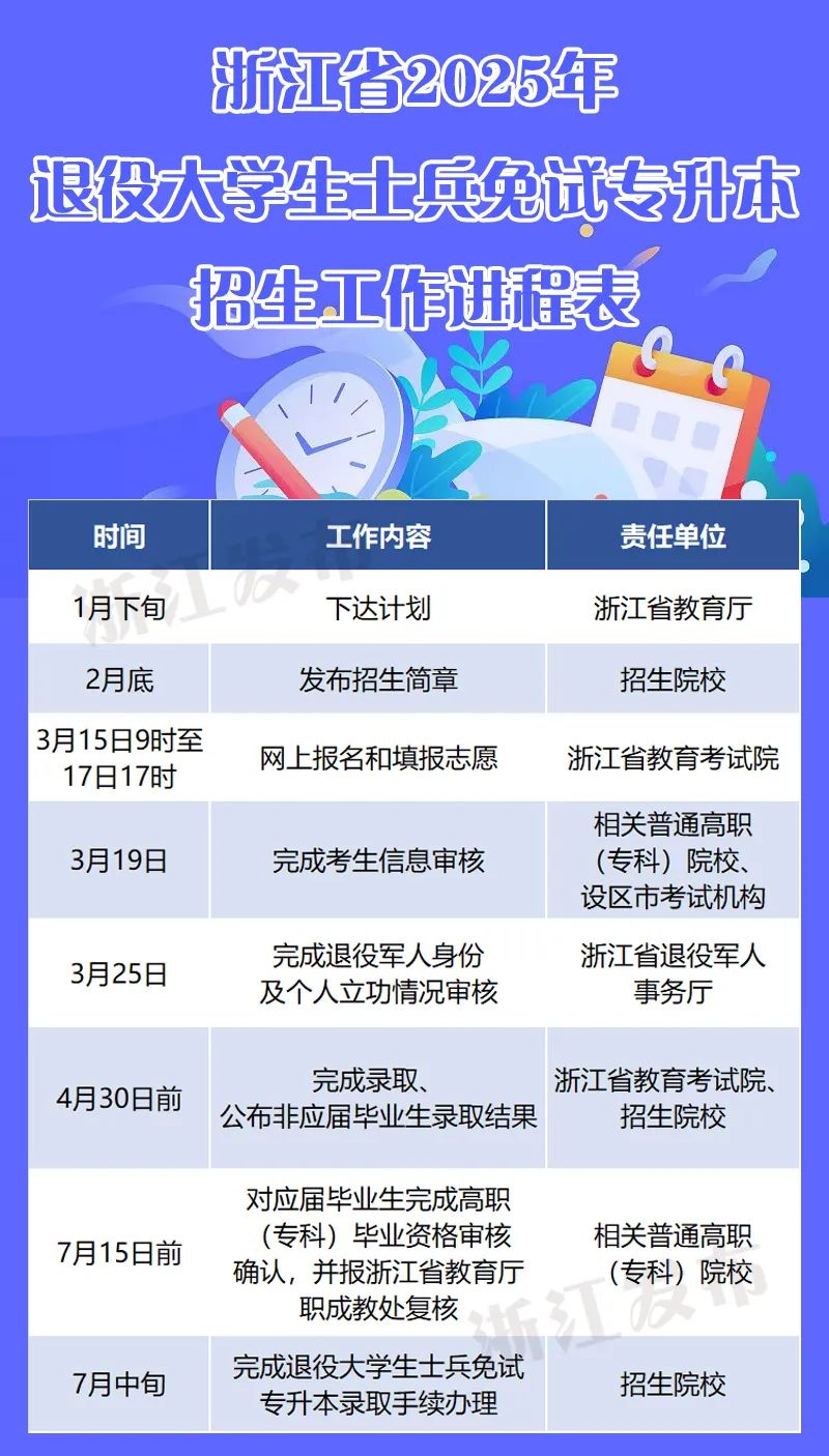 近日,省教育廳辦公室、省退役軍人事務(wù)廳辦公室印發(fā)《浙江省2025年退役大學(xué)生士兵免試專升本招生工作實(shí)施辦法》,明確了招生對(duì)象、招考類別、志愿填報(bào)等,具體內(nèi)容一起了解: