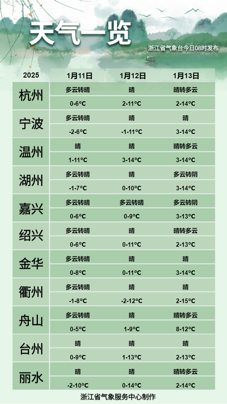 白天全省晴到多云;夜里全省多云部分陰有時有小雨,其中浙中北山區(qū)局部有小雨夾雪或小雪。