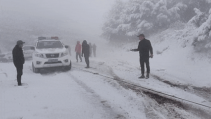 受降雪影響,嵊州四明山區(qū)積雪較深,多輛私家車因輪胎打滑被困山道。嵊州市紅十字應(yīng)急救援隊巡邏中發(fā)現(xiàn)后,立刻展開緊急救援行動。