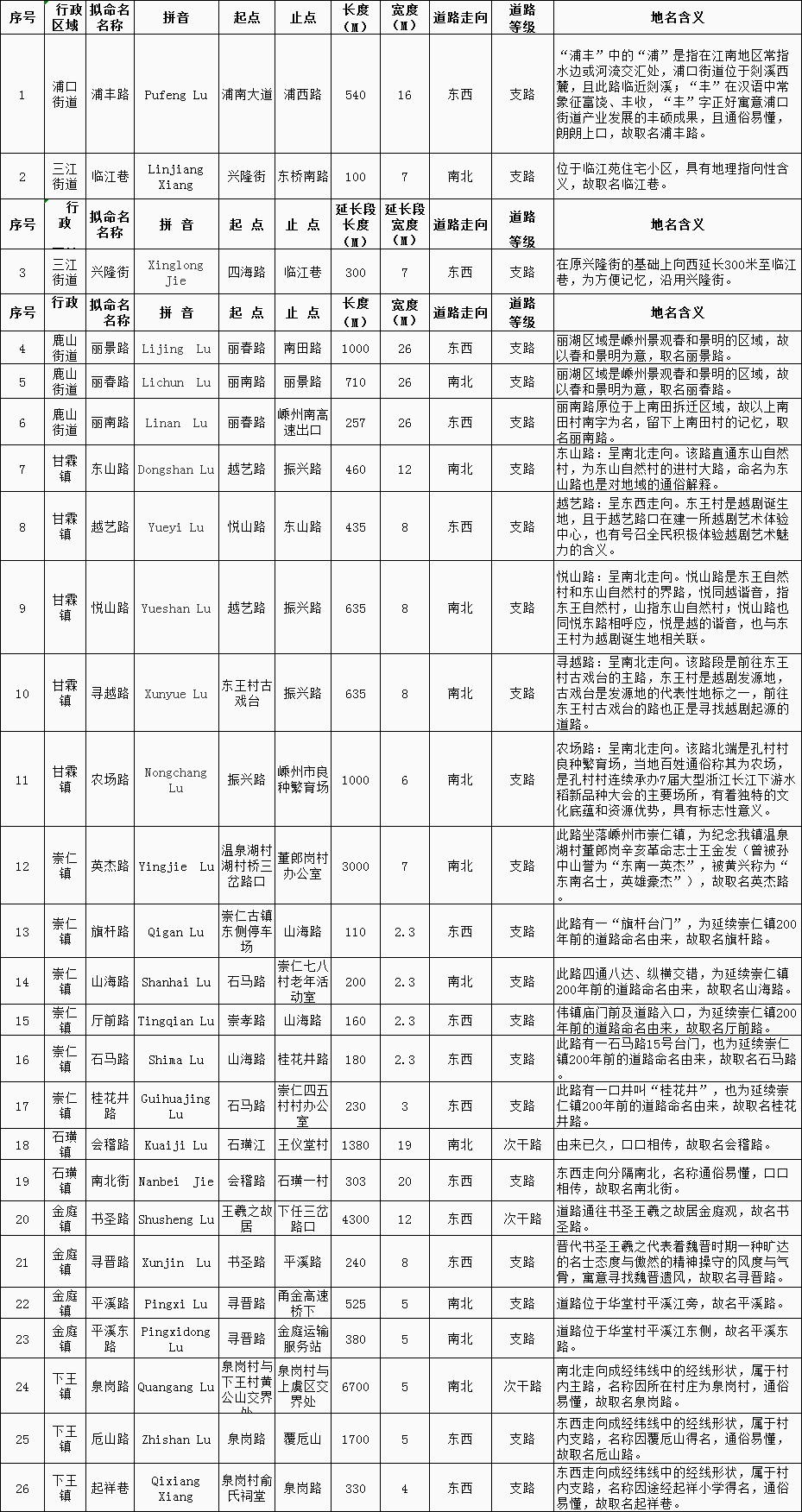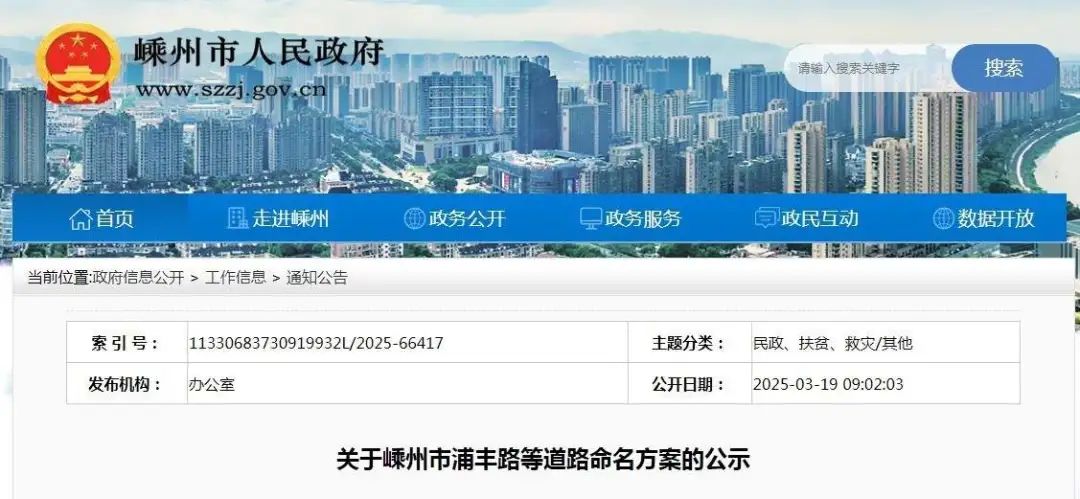 3月19日,嵊州市民政局在嵊州市人民政府官網(wǎng)發(fā)布了《關(guān)于嵊州市浦豐路等道路命名方案的公示》,向社會(huì)各界和市民群眾征求意見。具體如下: