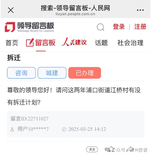 近日,有“用戶10*****7”在人民網(wǎng)領(lǐng)導(dǎo)留言板里提問,這兩年浦口街道江橋村有沒有拆遷計劃?