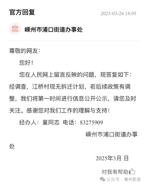 對此, 嵊州市浦口街道辦事處答復(fù),江橋村現(xiàn)無拆遷計劃。