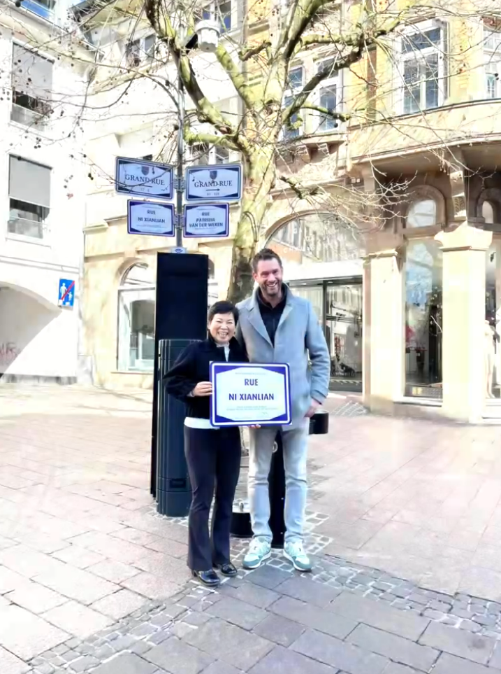倪夏蓮在視頻中介紹道:這里是盧森堡城市的市中心,也是步行街,走在這條大街上我感慨萬千,這次我們的市政府給了我很高的榮譽(yù),以我的名字命名了這條街。
