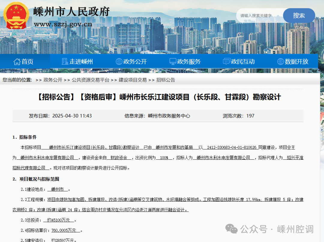 本招標項目 嵊州市長樂江建設(shè)項目(長樂段、甘霖段)勘察設(shè)計 已嵊州市發(fā)展和改革局以2412-330683-04-01-810626 同意建設(shè),項目業(yè)主為 嵊州市水利水電發(fā)展有限公司 ,建設(shè)資金來自 財政資金 ,出資比例為 100% ,招標人為 嵊州市水利水電發(fā)展有限公司 ,招標代理人為 紹興平準招標代理有限公司 ?,F(xiàn)對該項目的勘察設(shè)計服務(wù)進行公開招標。