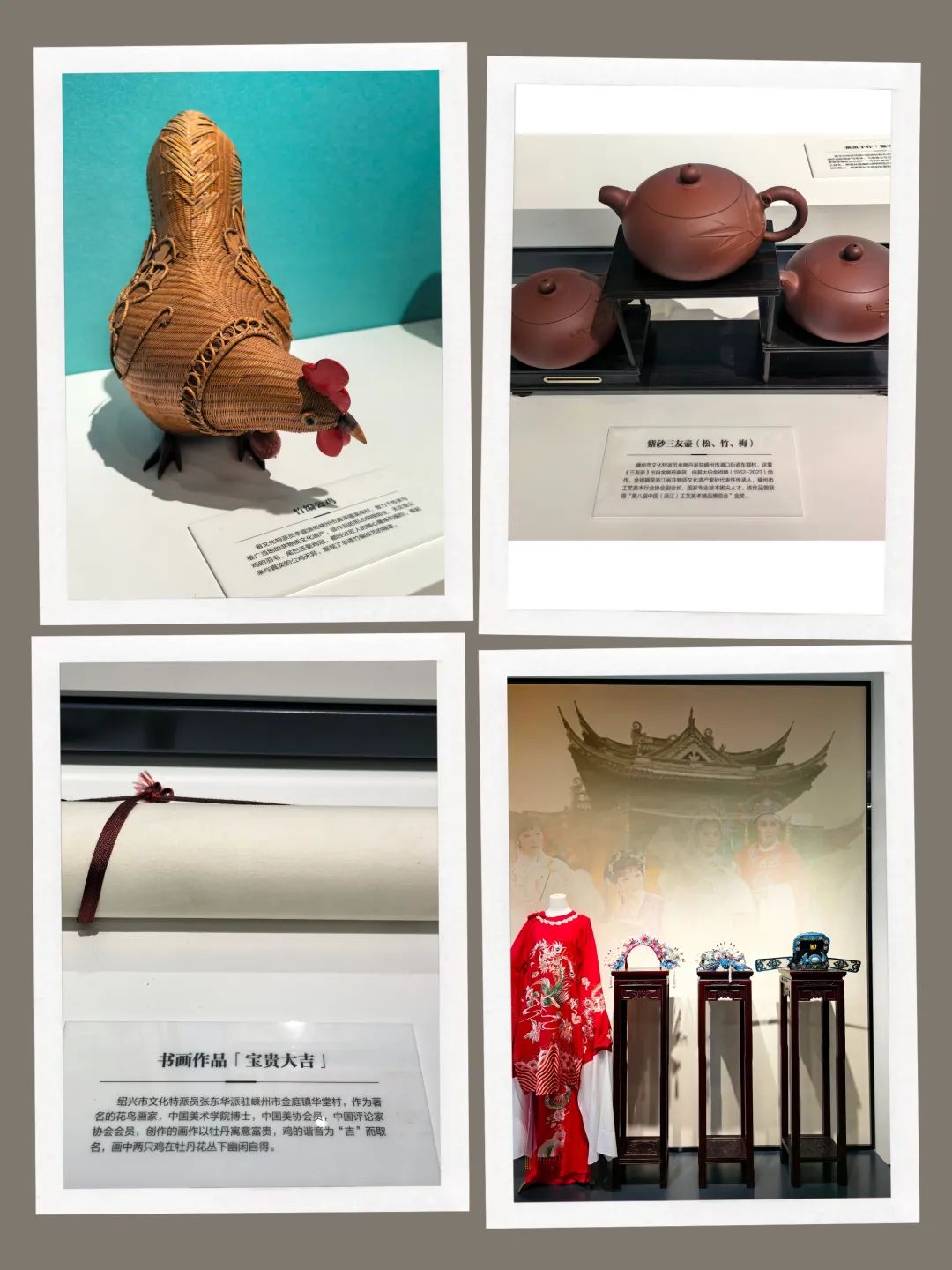 在省文化特派員之家展示館內(nèi),嵊州選送的4位文化特派員作品成為亮點(diǎn):國(guó)家級(jí)非遺嵊州竹編傳承人創(chuàng)作的竹編公雞,嵊州市“黃澤戲劇服裝制作技藝”非遺傳承人、越劇文化特派員李華英制作的4套經(jīng)典越劇服飾,文化特派員金曉丹選送的由浙江省非遺紫砂代表性傳承人金祖稠制作的紫砂三友壺(松、竹、梅),以及中國(guó)美院博士、知名花鳥(niǎo)畫(huà)家、紹興市文化特派員張東華教授創(chuàng)作的“寶貴大吉”書(shū)畫(huà)作品等,集中展現(xiàn)了嵊州濃厚的文化特色。