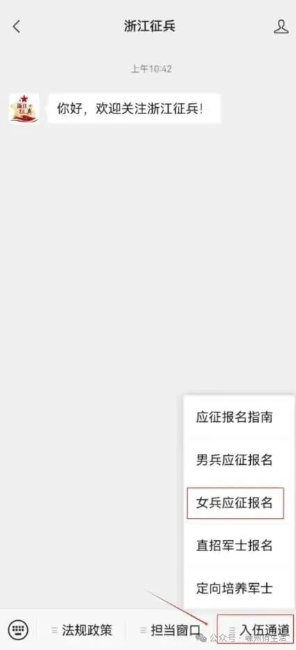 搜索并關(guān)注“浙江征兵”微信公眾號(hào)進(jìn)入子菜單欄,點(diǎn)擊右下角“入伍通道”,進(jìn)行應(yīng)征報(bào)名。