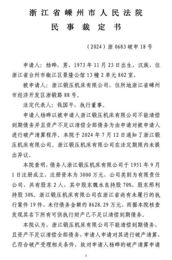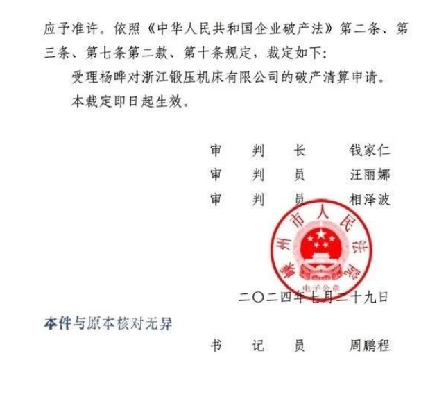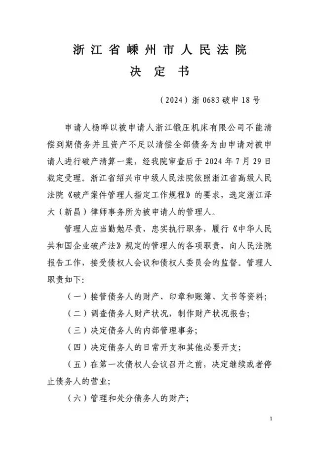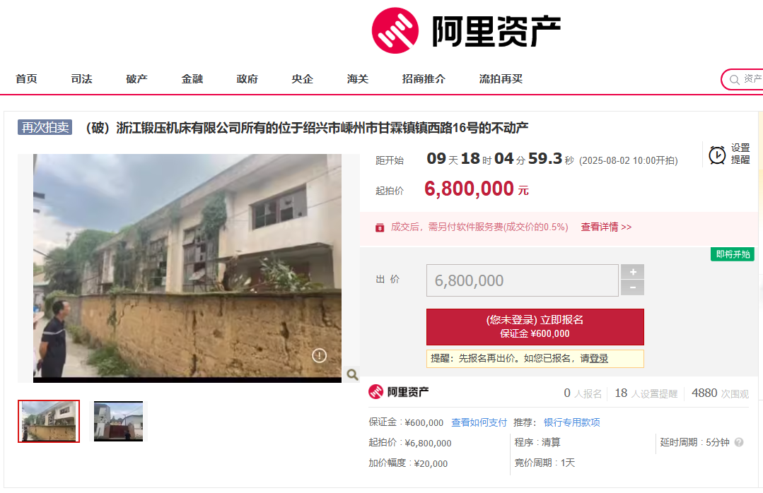 浙江鍛壓機(jī)床有限公司管理人將于2025年8月2日10時(shí)至2025年8月3日10時(shí)止(延時(shí)的除外)在淘寶網(wǎng)阿里拍賣破產(chǎn)強(qiáng)清平臺(tái)(處置單位:浙江鍛壓機(jī)床有限公司管理人,監(jiān)督單位:嵊州市人民法院,網(wǎng)址:https://susong.taobao.com/)進(jìn)行公開拍賣活動(dòng)?,F(xiàn)公告如下: