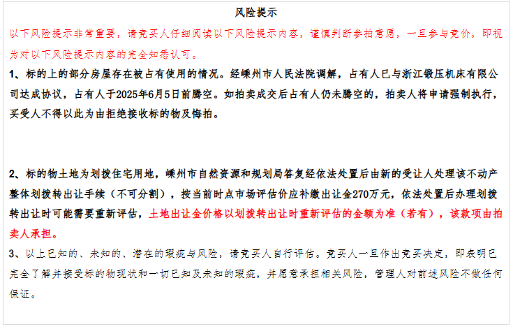 標(biāo)的物情況復(fù)雜,請(qǐng)競買人無比仔細(xì)閱讀標(biāo)的物介紹,特別是風(fēng)險(xiǎn)提示,慎重考慮。一經(jīng)參與競價(jià),即視為已對(duì)標(biāo)的物實(shí)際情況及風(fēng)險(xiǎn)提示內(nèi)容知悉并接受。