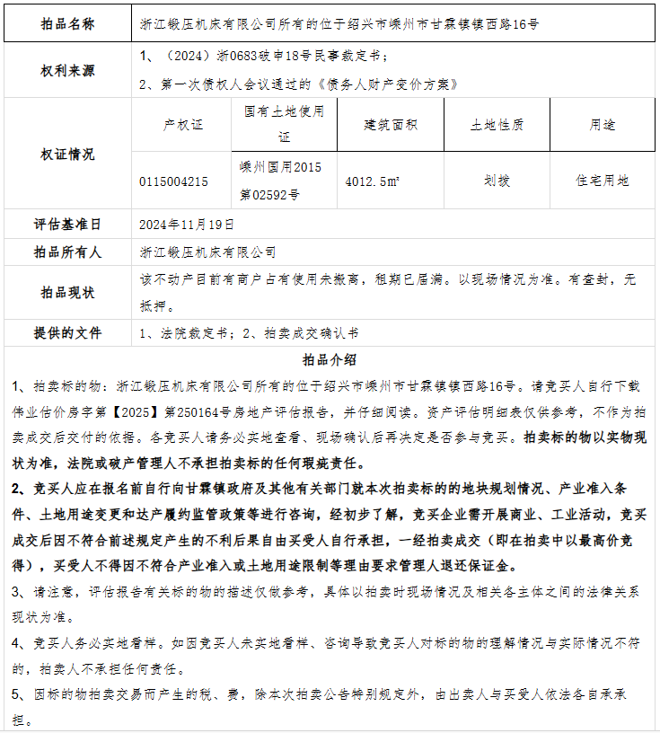 本次拍賣的標(biāo)的物為浙江鍛壓機(jī)床有限公司所有的位于紹興市嵊州市甘霖鎮(zhèn)鎮(zhèn)西路16號(hào)不動(dòng)產(chǎn)。評(píng)估總價(jià)為17200000.00元,具體情況、瑕疵等詳見標(biāo)的物介紹,并以成交時(shí)現(xiàn)場情況及相關(guān)各主體之間的法律關(guān)系現(xiàn)狀為準(zhǔn)。