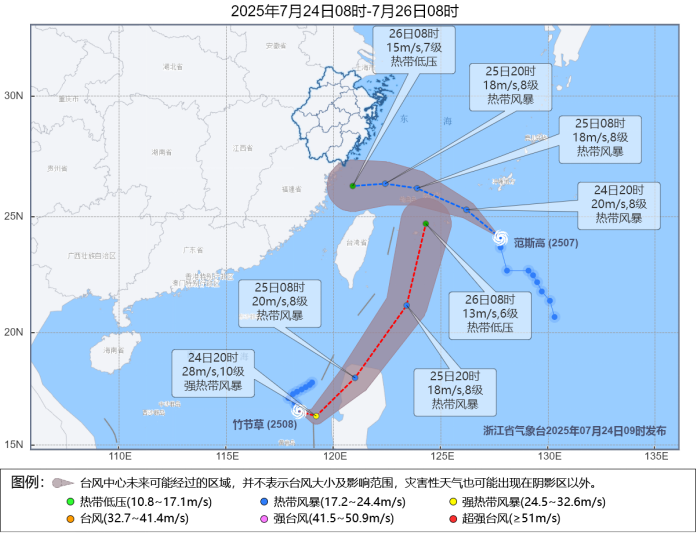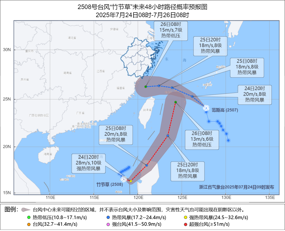 預(yù)計“范斯高”將以每小時15~20公里的速度向西北方向移動,將于今天傍晚到夜里移入東海南部海面,并向浙江南部到福建北部一帶沿??拷?6日減弱為熱帶低壓,在浙閩近海徘徊,也不排除在浙閩沿海登陸。